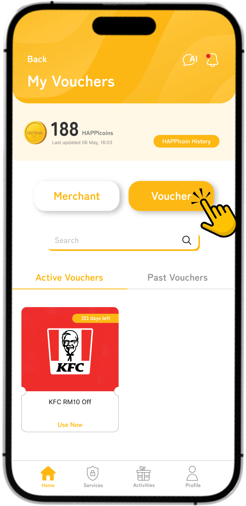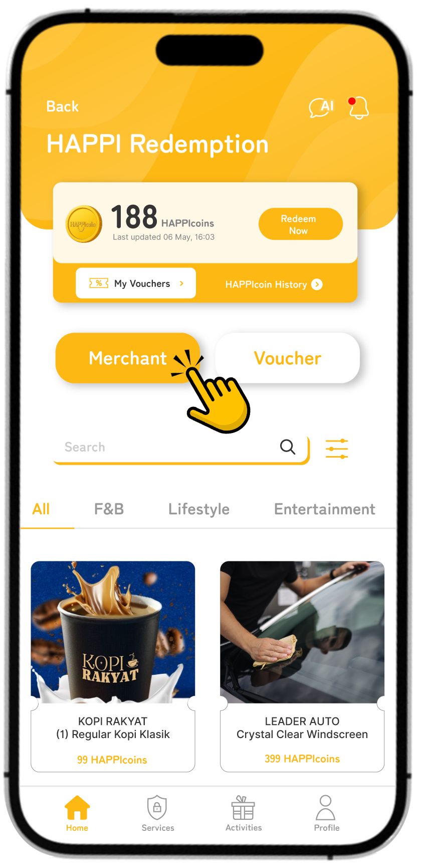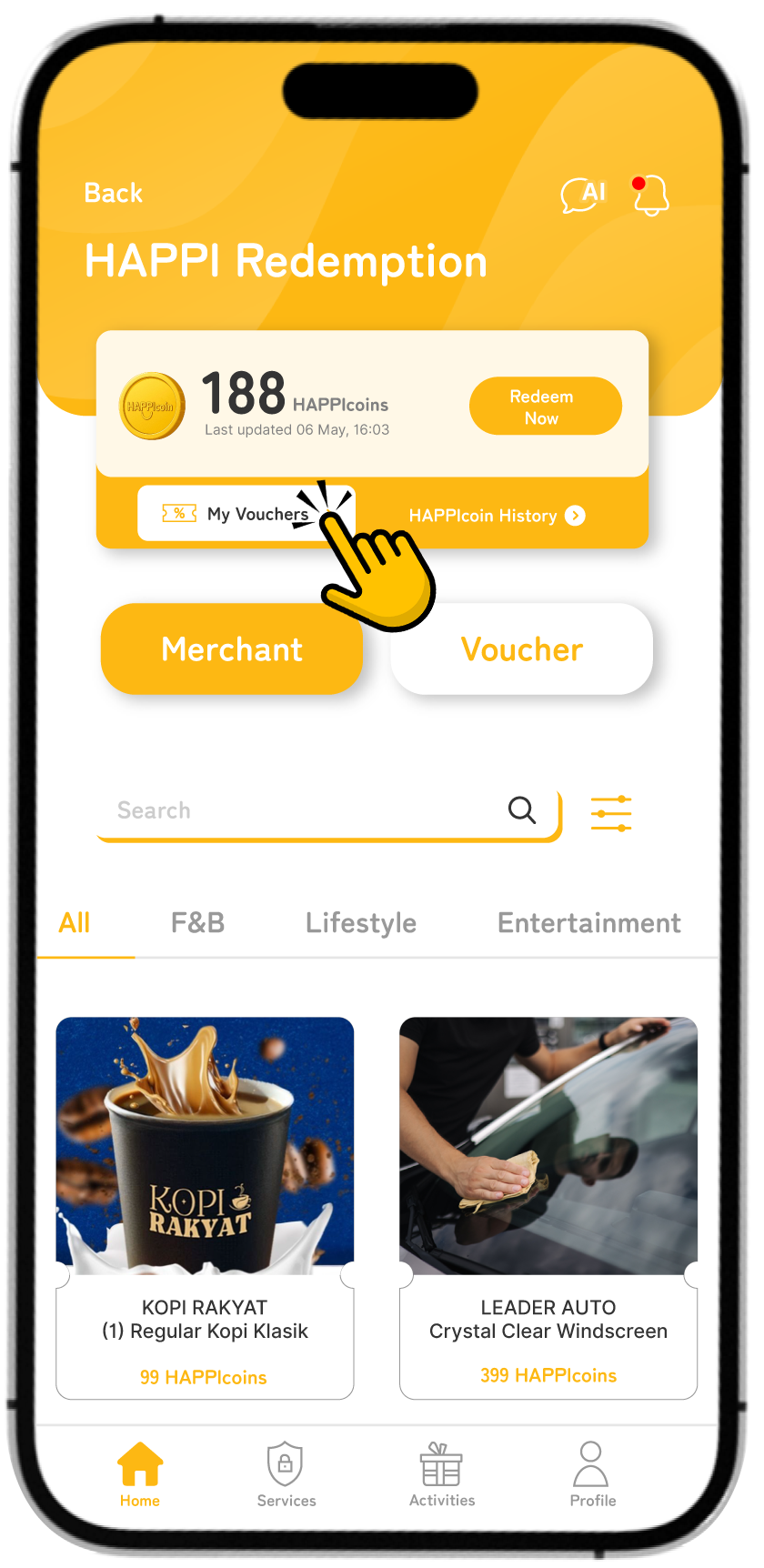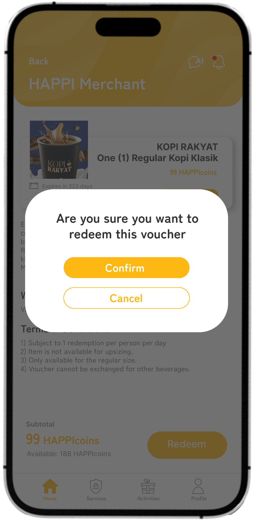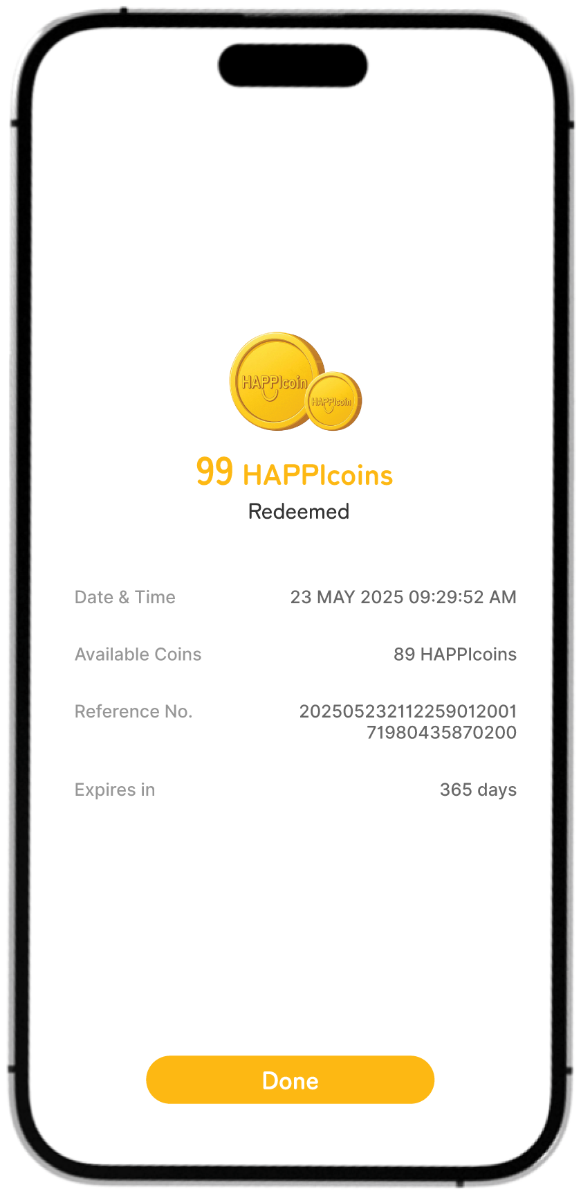 HAPPIcoin is our exclusive rewards program that lets you redeem vouchers, goods and services across various categories — from wellness to daily essentials.